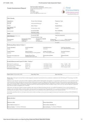 The purpose of this report is to document as much information about your baby as possible, giving you a written record of your unborn child’s status at the time of your scan. This will give you something to reflect on following the scan, allowing you to better retain visual details about your pregnancy that you may have missed during your visit or simply forgotten about afterwards.
